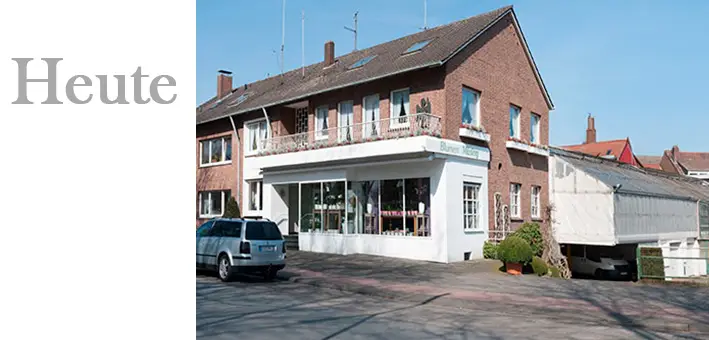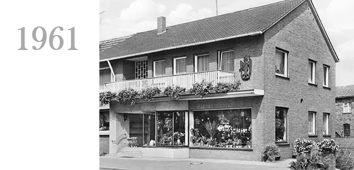 1961 wurden der gesamte Betrieb und das Wohnhaus umgebaut. Die alten Erdhäuser mußten den modernen Gewächshäusern (550 qm) weichen, und aus dem Blumenladen entwickelte sich unser Blumenfachgeschäft.